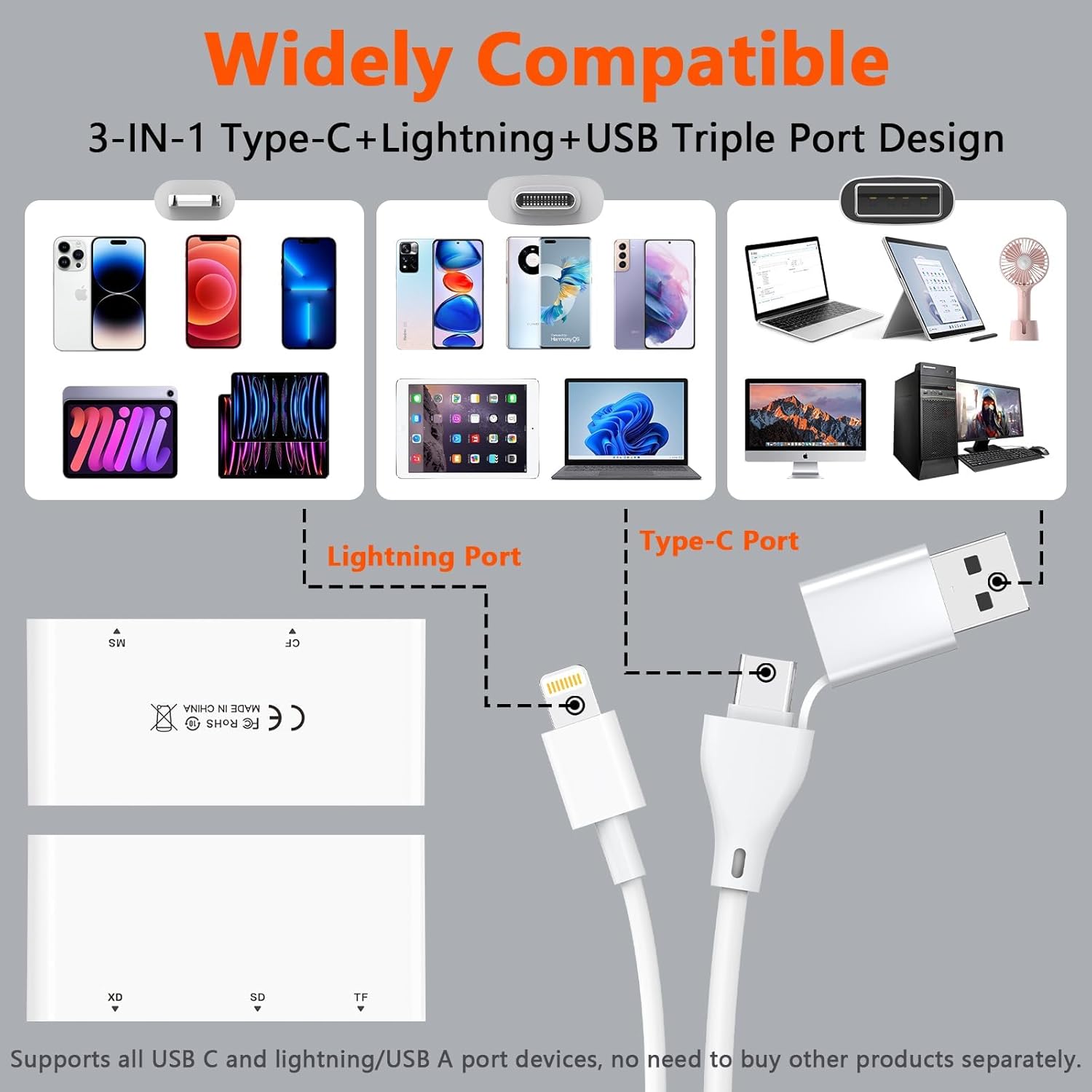 5-in-3 Memory Card Reader, Lightnin-Type C-USB A Three Connector to SD/TF/CF/Micro SD/XD/MS USB OTG Adapter, Multi Memory Card Reader for iPad/iPhone/Android/MacBook/PC with Mac/Windows/Linux/Android