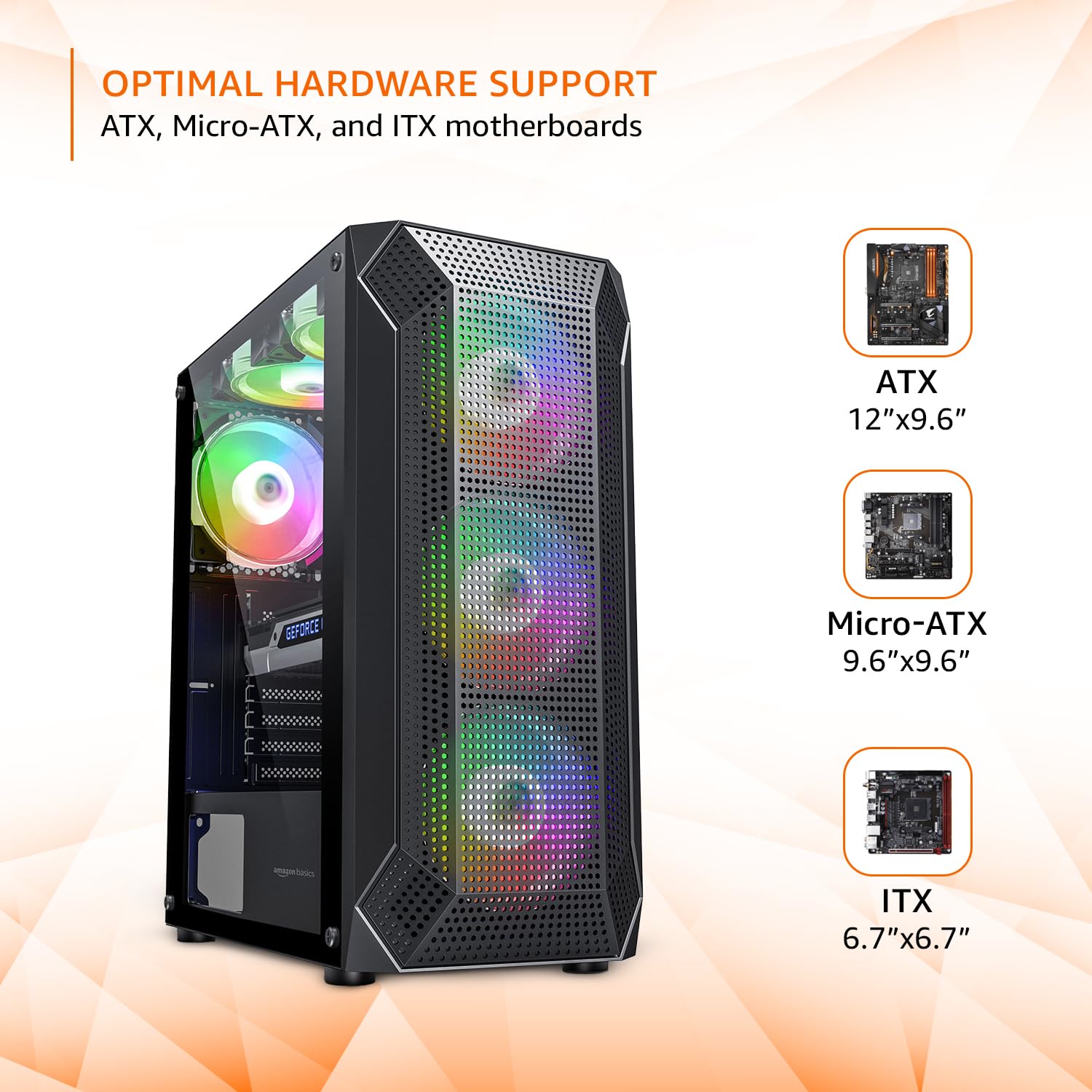 Introducing the Amazon Basics Mid Tower Gaming Cabinet. It is compatible with ATX, Micro-ATX, and Mini-ITX motherboards, making it a convenient choice. Moreover, it features 2 USB 2.0, 1 audio input, and 1 mic port which helps the user connect multiple devices at once. Supports 6 fans, it enables superior heat dissipation. The front Mesh panel adds a touch of style to your PC setup.