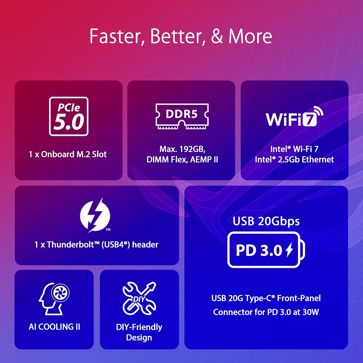 Abundant Connectivity: USB 20Gbps rear I/O port and front-panel connector with PD 3.0 up to 30W, eleven additional USB 10Gbps ports, PCIe 5.0 x16 SafeSlot, HDMI 2.1, and DisplayPort 1.4