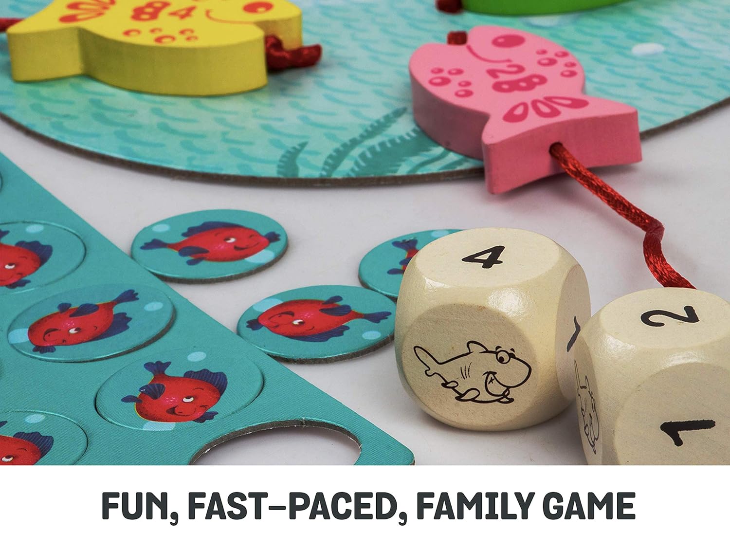 Contains: 2 wooden number dice, 4 wooden Fish with cords, 1 Shark glove, 42 Fish tokens, 1 sea board, game guide.