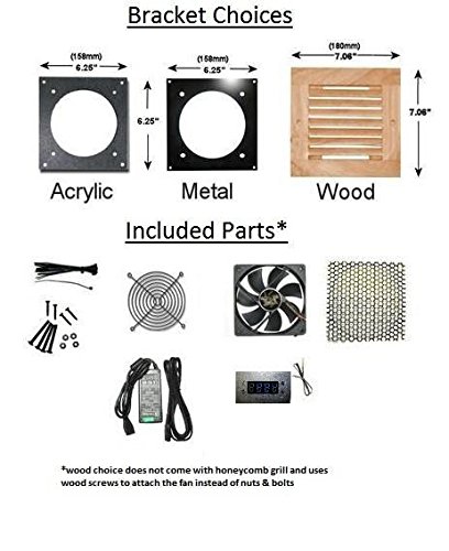 Completed Fan and Bracket Dimensions when assembled using the included parts:Acrylic:6.25″ x 6.25″ x 1.38″ (159 x 159 x 35mm)Cutout size: Acrylic: 5″ x 5″ (130 x 130mm)
