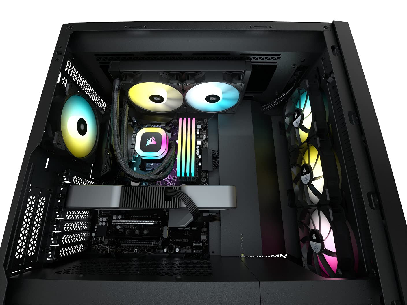 Corsair H100 RGB 240mm CPU Cooler, 2X 120mm CORSAIR SP RGB ELITE PWM fans, 29 Total individually addressable RGB LEDs, fan speeds running up to 1,500 RPM, 240mm radiator