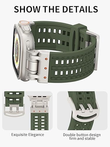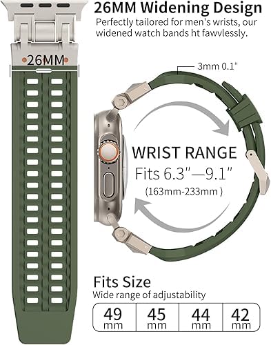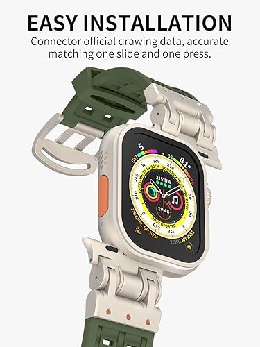 New Upgrade Metal Connector: Features a unique design with ultra-secure pin buckle that locks your Apple Watch in place, providing a textured and refined look. Ideal for men who push boundaries and seek reliability.Breathable & Comfortable: The band’s innovative breathable and sweat-ventilating structure ensures comfort even during intense activities. Its soft, non-irritating material, combined with a metal buckle for a firm fit, offers both comfort and reliability.