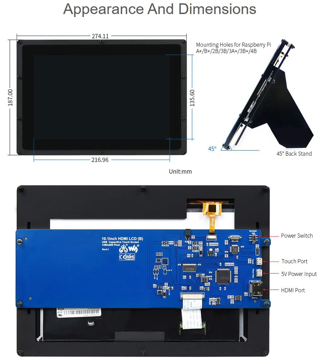 IPS, 1280×800, 10.1 inch Capacitive Touch Screen LCD, Supports Multi mini-PCs, Multi Systems Capacitive touch control, supports up to ten-points touch Capacitive touch control, supports up to ten-points touch When works with Raspberry Pi, supports Raspbian, Ubuntu, Windows , single touch, and driver free When work as a computer monitor, supports Windows 8.1/8/7, ten-points touch, and driver free