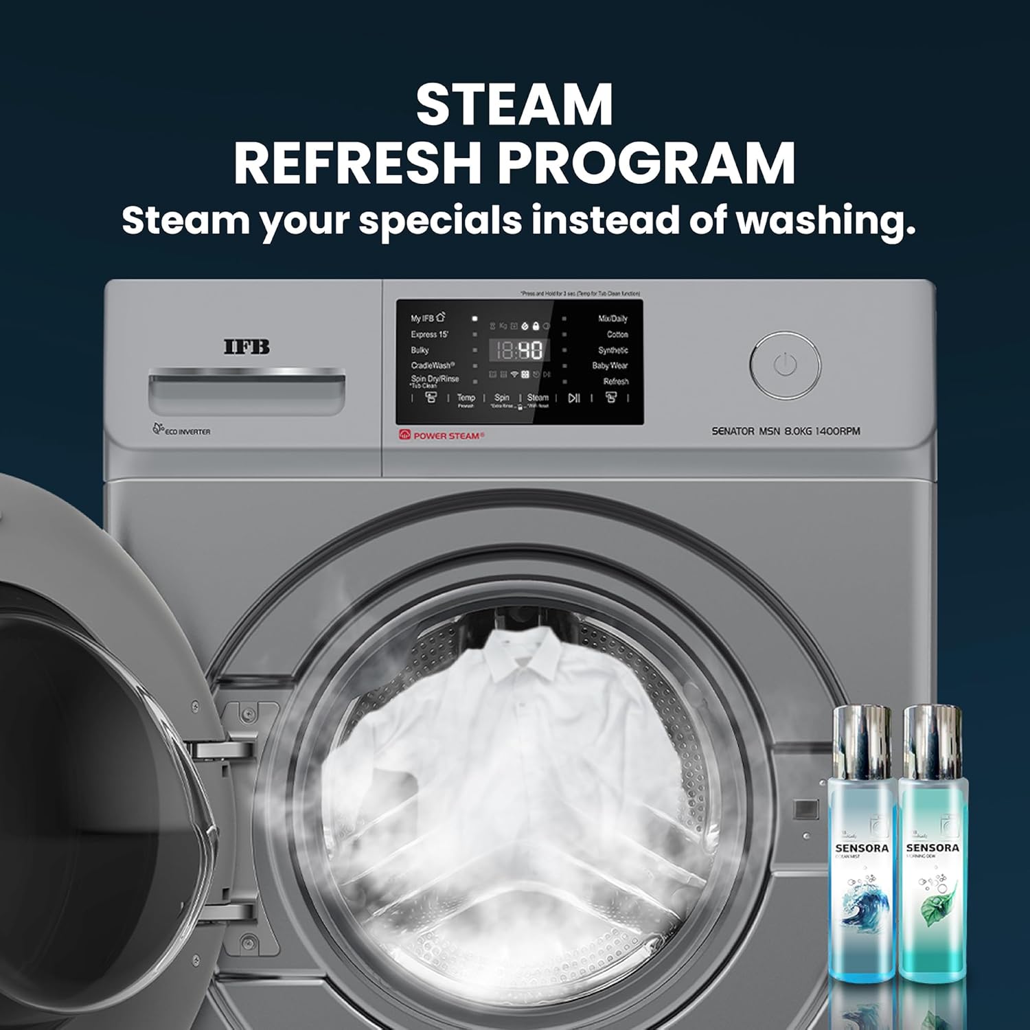 Wash Programs: 10 Wash Programs – Mix/Daily, Cotton, Synthetic, Baby wear, Refresh, Bulky, Cradle Wash, Express 15′, My IFB, Spin/Dry and Rinse + Tub Clean