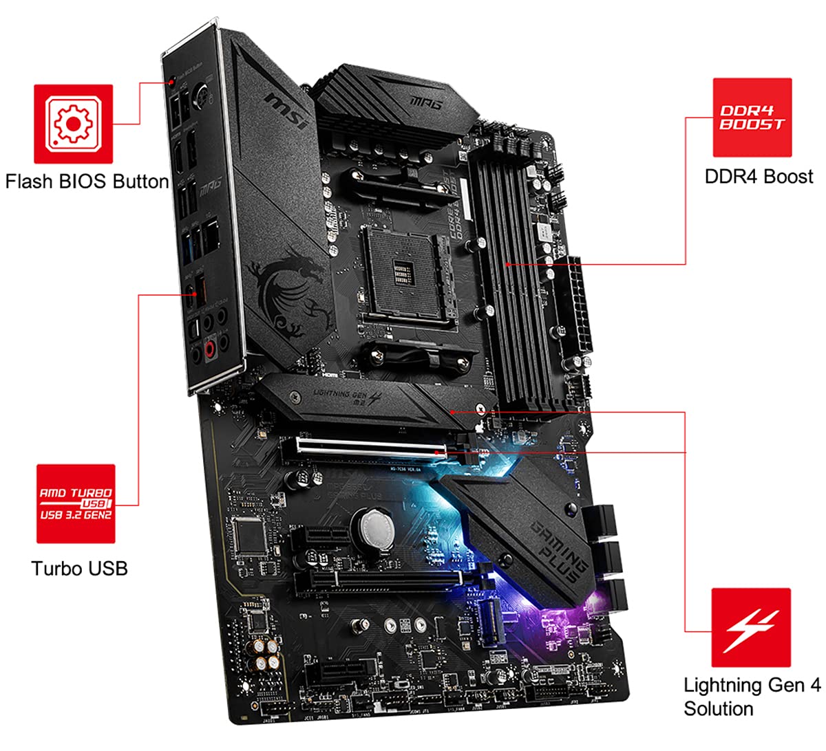 MSI MPG B550 Gaming Plus ATX Gaming Motherboard. PCIe 4.0, Lightning Gen 4 x4 M.2 with M.2 Shield Frozr, AMD Turbo USB 3.2 GEN 2, Supports DDR4 Memory, up to 4400(OC) MHz, Supports AMD Ryzen 5000 & 3000 Series desktop processors
