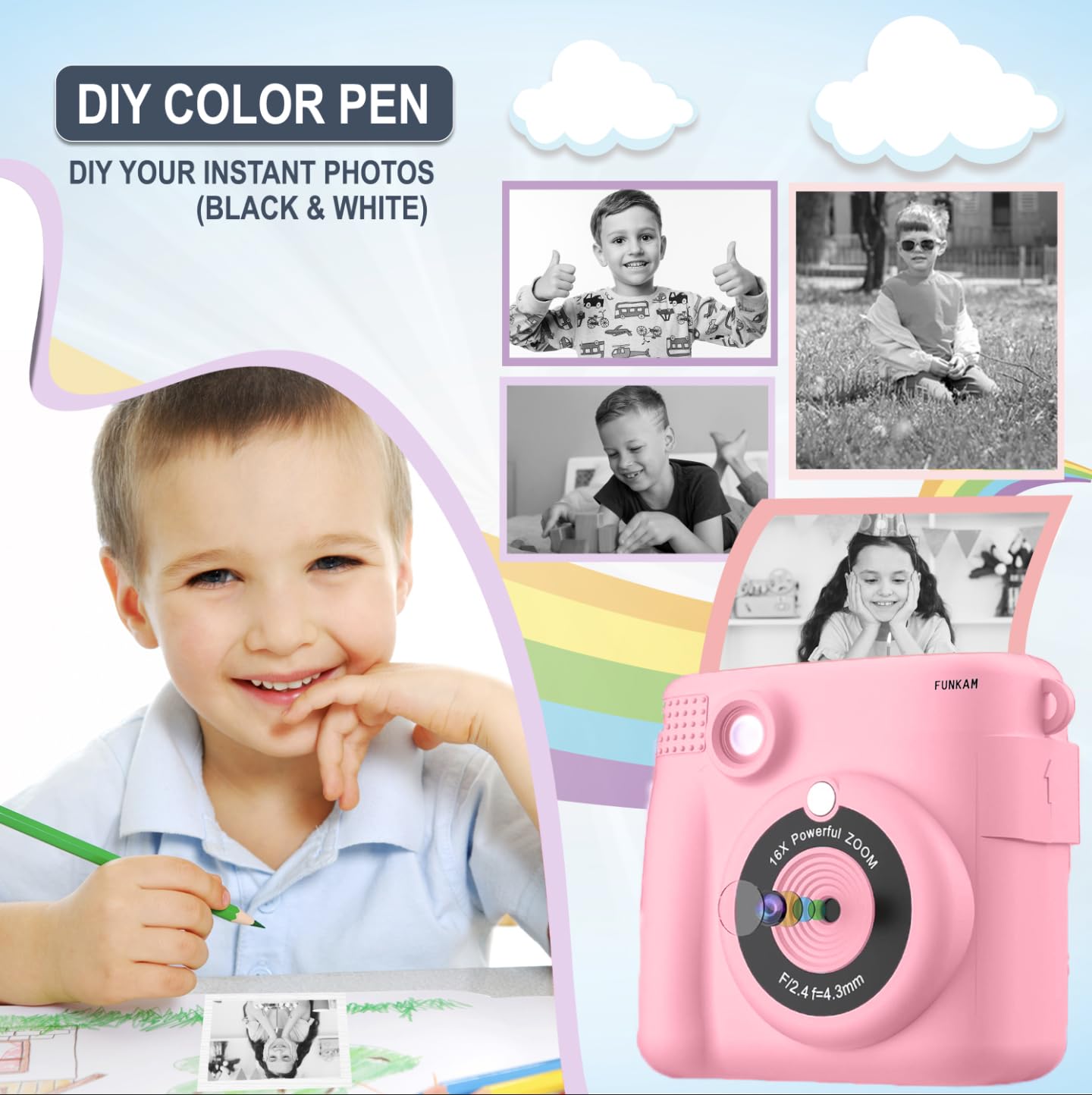 ?【Multifunctional kids digital camera 】Multifunctional digital pink camera for kids: this mini camera with instant print, 2.4 inch big screen, 1080P video, 16 times digital zoom, flash, time lapse, continuous shooting, games, filter frame, mp3. This can meet the different needs of children. It is a good choice to accompany children to grow up happily. Bring a wonderful moment to you and your family.