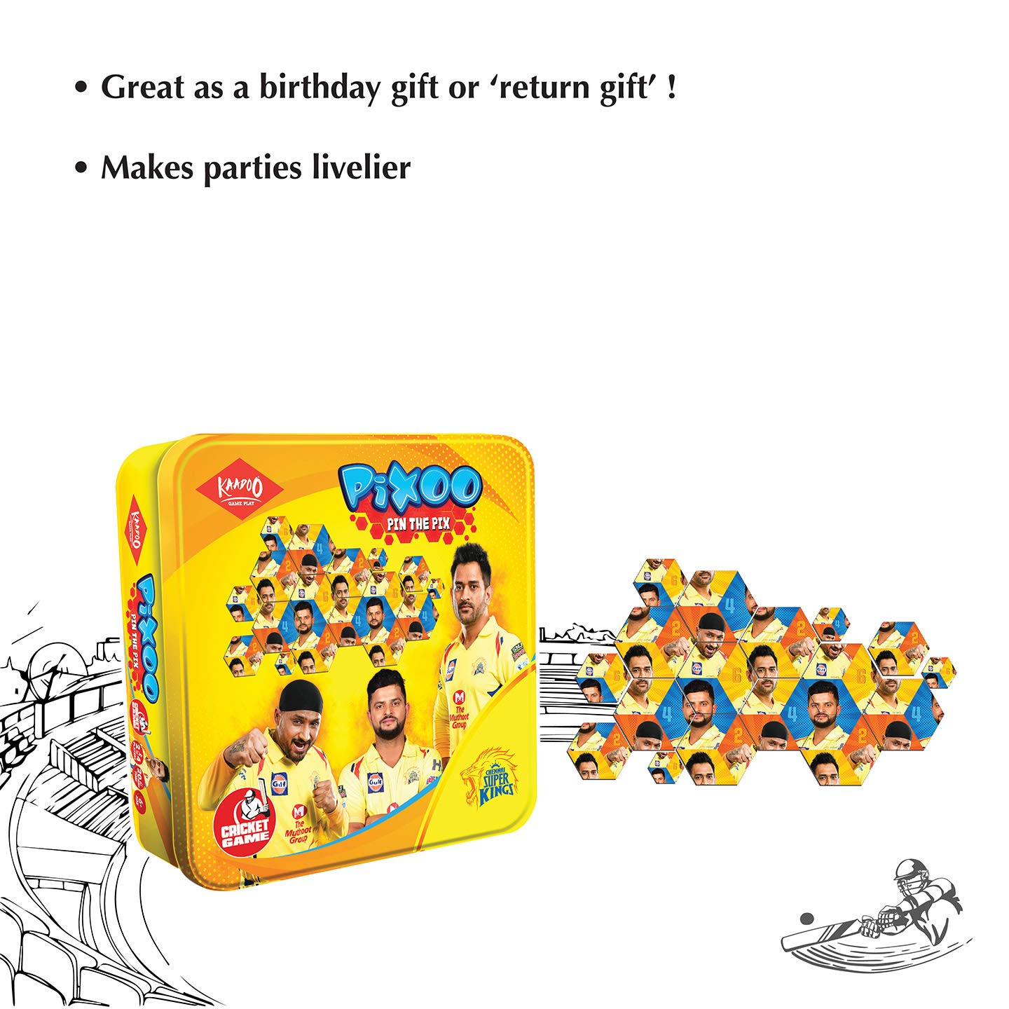 > Are you a cricket buff? Test your skills with thrilling action-packed games! > Take home the yellow army. Try these exciting games that is great as both birthday and return gift. > Play the game with CSK. Games that deliver fun consistently. Just like the CSK LIONS! > Designed with extreme diligence, high-quality & non-toxic colors, soft edges, and original player images under the license from Team CSK. > Great for boosting team-building and collaboration in professional work settings too.