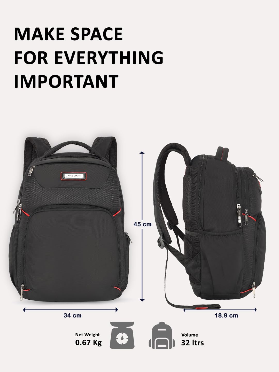 Lavie sport laptop backpack is made from durable premium polyester material for professional work. All features like padded laptop and tablet sleeves, spacious compartments, pass through strap, mesh shoulder strap, padded laptop sleeve, and multiple external pockets make it a long-lasting yet lightweight backpack.