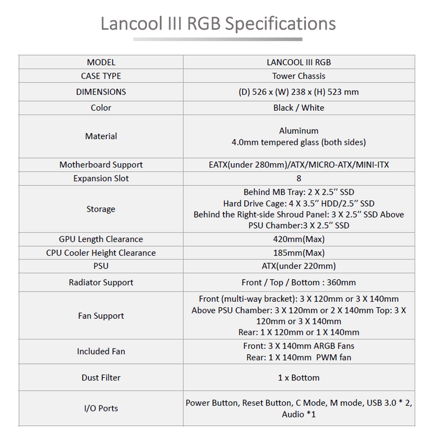 GPU Length Clearance : 420mm(Max) ; CPU Cooler Height Clearance : 185mm(Max) ; Dust Filter : 1 x Bottom