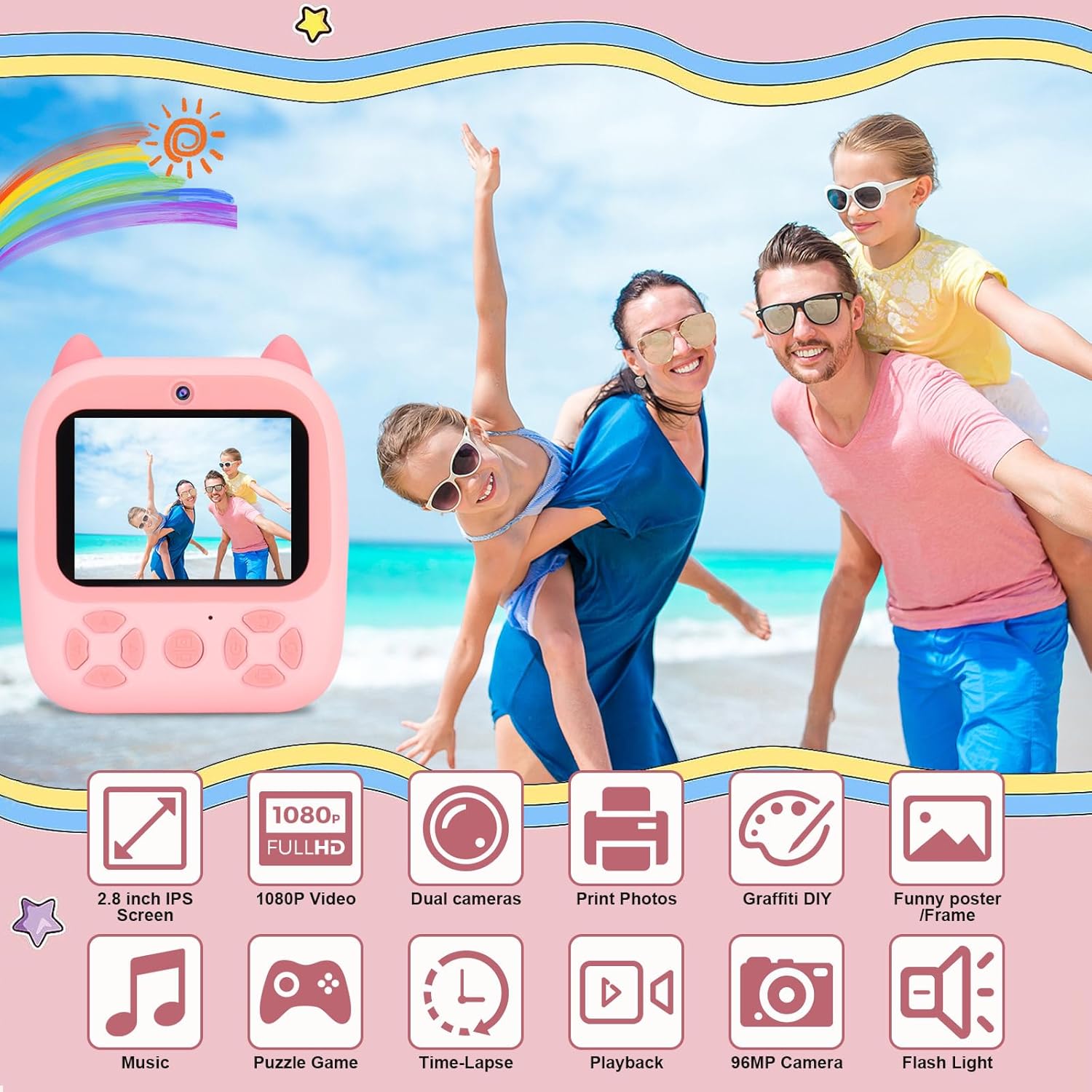 [96MP Dual Lens Digital Camera for Kids] ?With 96MP front and rear dual lenses, our kids camera captures stunning photos and videos. Even without printing paper, kids can take photos and videos anytime, anywhere. High-definition color images and 1080P videos are automatically saved in the 32GB memory card. The camera also features a 10x digital zoom and built-in smart fill light. ??