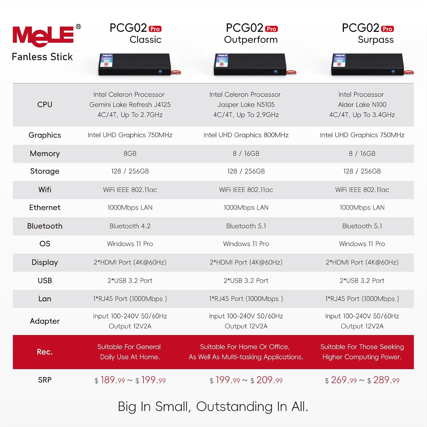 8GB DDR4+256GB eMMC – The PCG02 Pro hdmi stick pc equipped with 8GB of 2933MHz DDR4 RAM, 256GB stable eMMC, with a Micro SD port support expanding up to 2TB( This N5105 model is not support SSD expansion due to the limited PCB space).