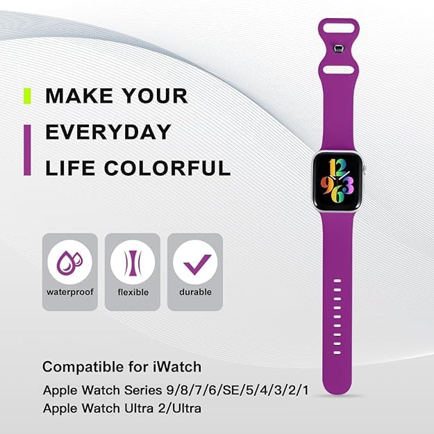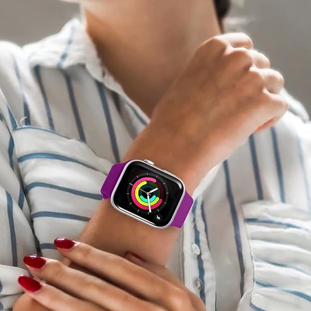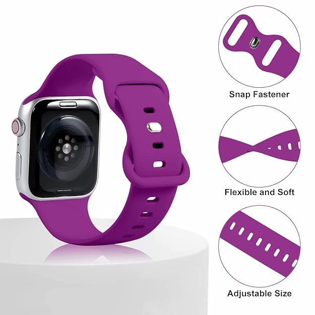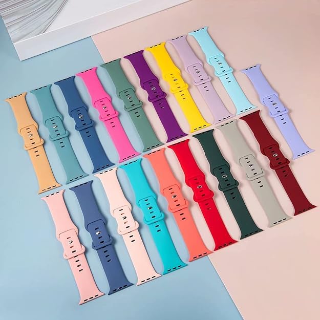 Compatible Model: 45mm 44mm 42mm Bands Compatible with New Apple Watch Series 9 (2023) 45mm, 8 (2022) 45mm, 7 (2021) 45mm, SE2 (2022)/SE & Series 6 (2020) , Series 5 (2019) ,Series 4 (2018) 44mm, Series 3 (2017) & Series 2 (2016) & Series 1 (2015) 42mm. 41mm 40mm 38mm Bands Compatible with New Apple Watch Series 9 (2023) 41mm, 8 (2022) 41mm, 7 (2021) 41mm, SE2 (2022)/SE & Series 6 (2020) , Series 5 (2019) ,Series 4 (2018) 40mm, Series 3 (2017) & Series 2 (2016) & Series 1 (2015) 38mm. 49mm Bands Compatible with Apple Watch Ultra 2 (2023)/Ultra (2022) Features: Material: Made of High-Quality flexible and durable soft silicone. Waterproof, lightweight and comfortable to wear. Stylish Buckle Design: Double silicone loop and peg closure, which is sturdy also skin-friendly. The same color clasp as the strap. Precise & Premium Connectors: Easy to install and keep your watch securely in place. You can switch the bands and it only takes seconds. Various Colors: Black, White, Navy Blue, Gray, Midnight Blue, Pink Sand, Wine Red, Light Pink, Rose, Pine Green, Teal and etc. Two Sizes: 41mm/40mm/38mm Size fits for 5.1″-7.1″ (130mm-180mm) wrist; 45mm/44mm/42mm Size fits for 5.9″ – 7.9″ (150mm-200mm) wrist. What you will get: 1 × Quality Bands for Apple Watch (No Watch, No Charger) — Please Choose the Correct Watch Model and Size for Yourself —