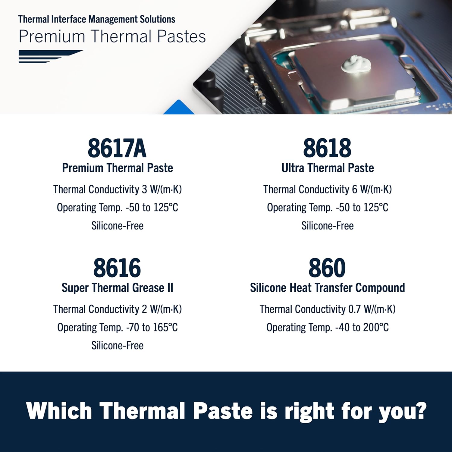 8617A silicone-free thermal grease is a heat sink grease with very high thermal conductivity and exceptional wetting properties. The thixotropic consistency helps ensure the paste conforms to the intricate geometry at the component/heatsink interface while avoiding bleed and pump out common with other pastes. 8617A has a wide operating temperature range, making it a practical solution where high heat dissipation and thermal cycling stability are needed. Once applied, circuits can be powered up immediately offering exceptional convenience. This thermal paste is most often used as a gap filler on heatsinks to CPUs, LEDs, and other electronic components. Its high thermal conductivity makes it ideal for energy-intensive devices like thermal sensors, IGBTs, thermal wells and power resistors. The paste’s soft consistency allows easy compression to achieve thin bond lines, minimizing thermal resistance. For applications demanding higher thermal conductivity, we have the 8618 whereas our 8616 and 860 is suited for applications requiring less heat dissipation. We also have a full line of thermally conductive adhesives which provide a permanent bond and thermal gels which offer tack adhesion where a low modulus material is needed.