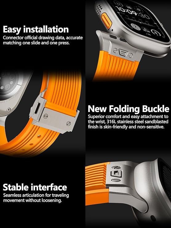 MOROFY Luxury Rugged Silicone Rubber Strap for Apple Watch Ultra 2 Band 49mm|45mm|44mm|42mm with Metal Connector & Folding Clasp for iWatch Ultra Series 9 8 7 6 5 4 3 2 1 SE – Orange