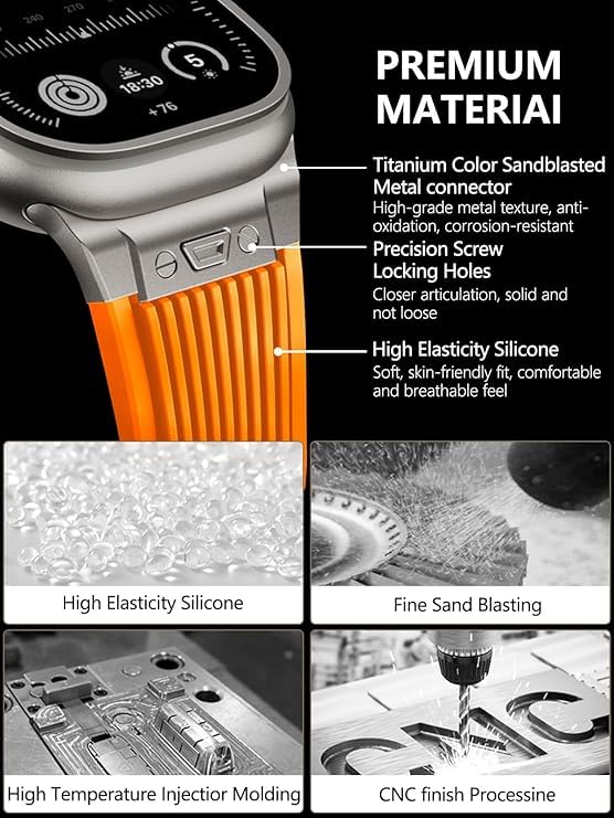 SANDBLASTED METAL CONNECTOR: The metal connectors on our iWatch Ultra Band are sandblasted for a premium metallic appearance, and the titanium color can match perfectly with the titanium case of the apple watch ultra, achieving a combination of luxury fashion and practical function, easy to install with a slide.