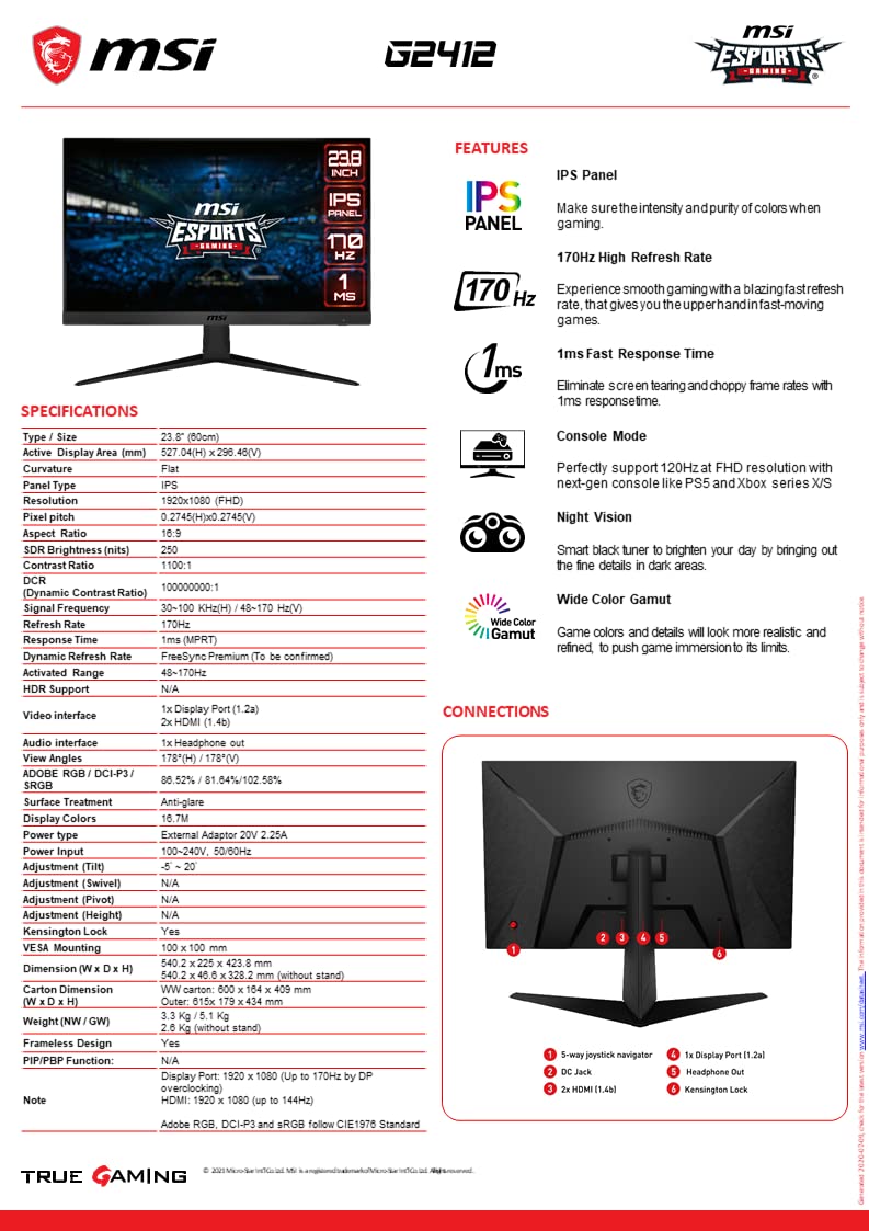 MSI G2412 Esports Gaming Monitor 23.8 Inch Full HD (1920×1080) IPS Panel 170Hz Refresh Rate 1ms Wide Color Gamut, AMD FreeSync Premium, Anti Glare, Less Blue Light, VESA Mount Black