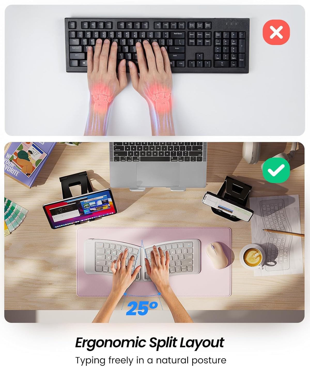 Ergonomic Split Layout: Experience unmatched comfort with our split keyboard layout. The innovative design allows for shoulder and arm relaxation, reducing the strain caused by traditional keyboards. Enjoy extended typing sessions without sacrificing your comfort and well-being.