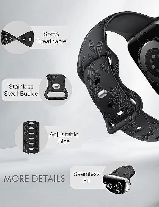 OXAI Made of high-performance silicone, this apple watch band not only delivers smooth and soft finish for bringing you comfortable wearing experience but also offers outstanding durability. Utilizing advanced laser engraving, our iwatch silicone band comes with a variety of floral and dandelion patterns in high definition. It does not wear off and fades over time, giving you a lightweight, flexible, and energetic feeling.