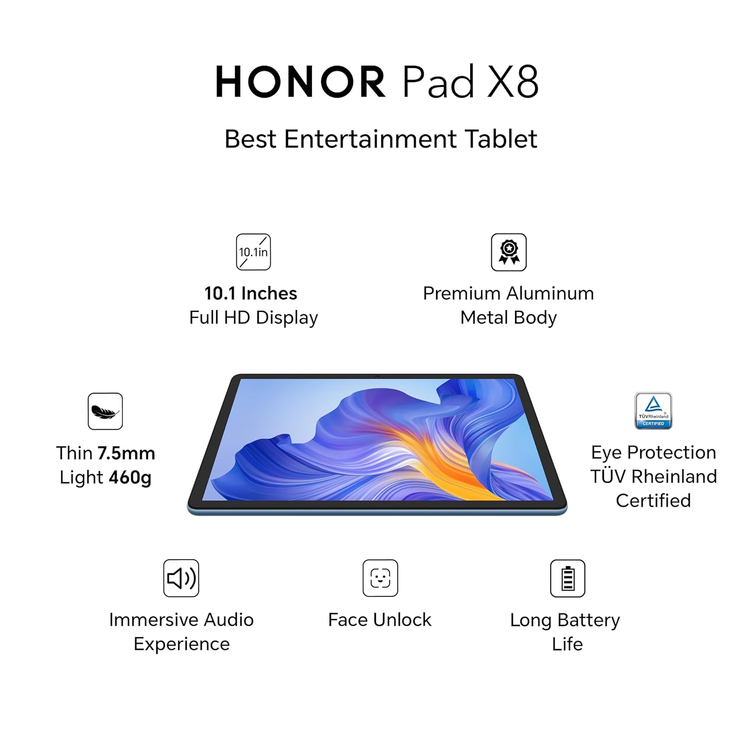 ? Storage? 4 GB RAM | 64 GB ROM | Expandable storage Up to 512 GB; ?Large Screen and Clear Visuals? HONOR Pad X8 equipped with 10.1-inch HONOR FullView display, with 80% screen-to-body ratio, sharp screen technology for transparent visuals