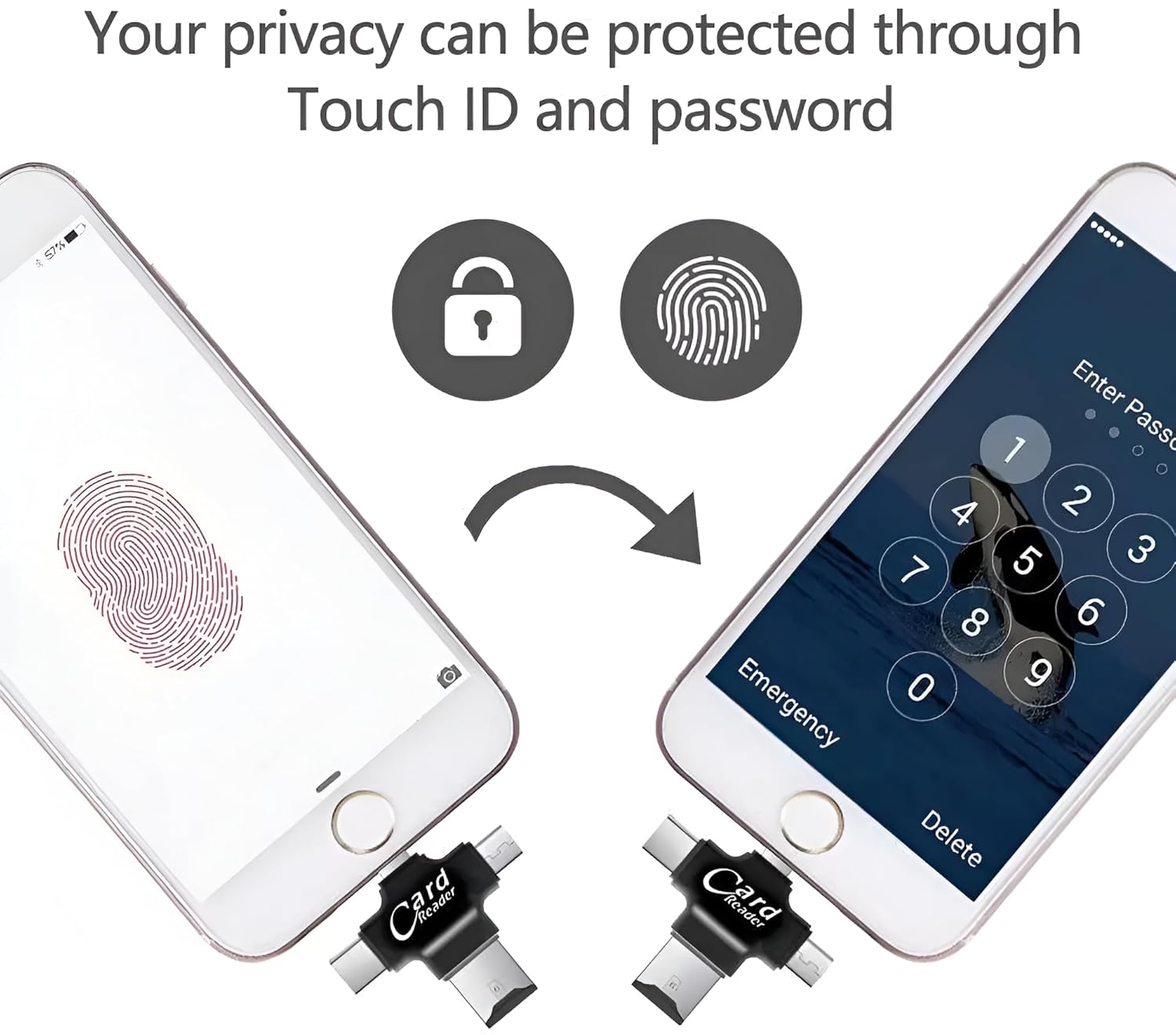 4 in 1 iPhone OTG Card Reader Supports 8GB to 128GB Memory Card Reader Fast Gratis up the Space of your Cameras, Android Devices, Lightning Flash Drive or Computer. Feature: Newest 4 in 1 TF (Micro SD) Card Reader, faster, smaller, thinner Gratis app Name ”iUSB Pro” from app store for communication between your iOS devices. Secured file encryption for private file. Securely store and share digital contents such as movies, videos, photos, files, pictures,and music from your phone. Wide Compatibility with Popular-format: Files: doc, ppt, xls, xlsx, pdf, html, txt. Photos: gif, jpg, png,jpeg. Videos: avi, flv, m4v, mkv, mov, mp4, rmvb. Music: m4a, aiff, caf, mp3, wav. Please Kindly Note: Micro-SD (TF) card is not included. No need to download and install “iUSB Pro” when using the card reader on Android, Type-C device and Computers, please enter to the phone “file manager” to operate. Card Reader works only with OTG supported devices in Android phones and tablets. Card Reader Can’t connect with Pendrive’s & Hard Disk. Multi Ports All-in-One SD/TF Card Reader for Flash Drive Memory Expansion — Always ready for you!. All in one solution for your demands, lightning connector is for iOS devices; USB C adapter for Type C devices, Micro USB connector is for Android devices (with OTG function); USB 3.0 connector is for computers/Mac. Gratis up the space of your SD/TF card and backup your important Photos, Music, Videos, and Contact list. Support 8G~128G SD/TF card (FAT32 and exFAT). Reading speed: 20~27M/S, Writing speed: 11~20M/S. Package Content: 1 piss 4in1 OTG Card Reader Lightning Type C Micro USB USB Card Reader.