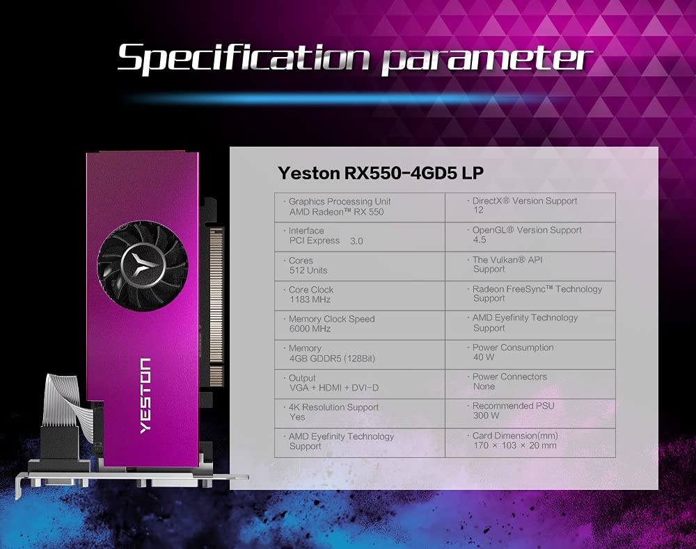 Plug and play: luxury power supply, all solid capacitors. The graphics card consumes only 40W at full load and is compatible with small wattage power supplies. Low power consumption, high performance.