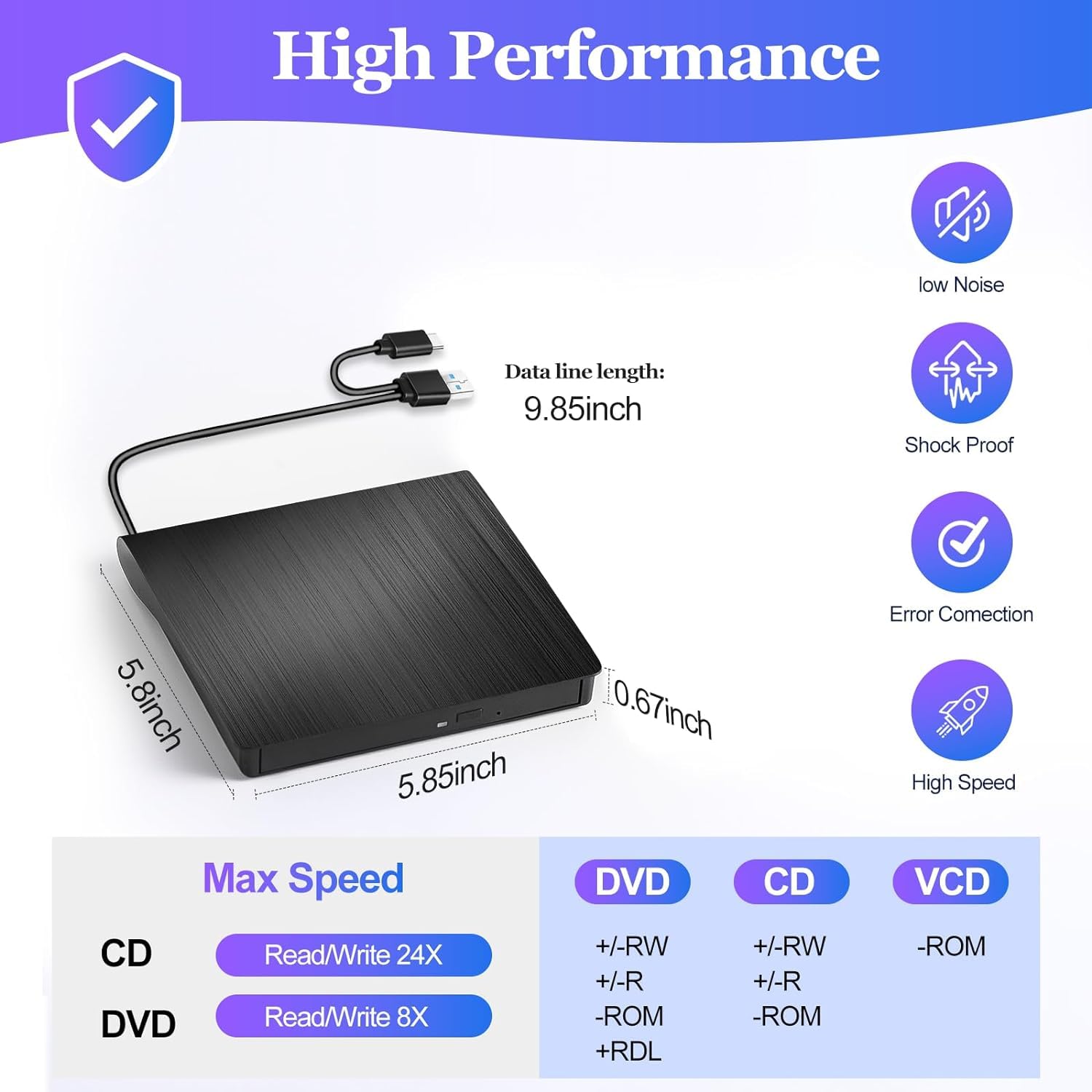 ?【CD/DVD Reader & Writer】This is a CD/DVD player, reader, writer, rewriter, recorder/burner, which supports multiple CD/DVD discs such as CD-ROM/ CD-R/ CD-RW/ DVD-ROM/ DVD-R/ DVD+R/ DVD-RW/ DVD+RW/ DVD+R DL/ DVD-R DL/ DVD RAM (CD max speed: 24X, DVD max speed: 8X)