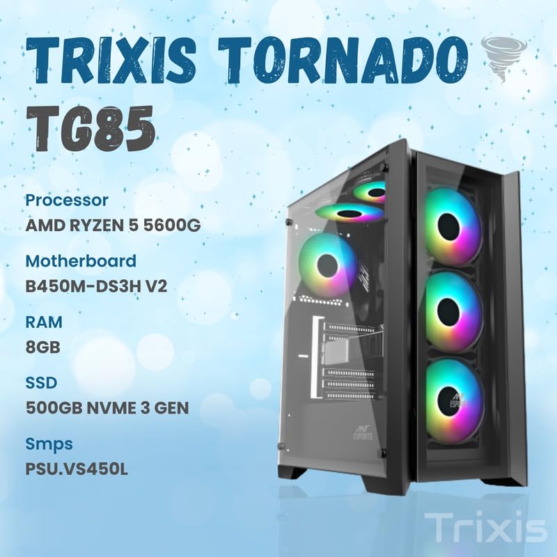 Unleash the Storm: Trixis Tornado TG85 Gaming PC Introduction: Prepare to be swept away in a gaming tempest with the Trixis Tornado TG85 Gaming PC. This gaming powerhouse features the AMD Ryzen 5 5600G processor, a robust B450M motherboard, and impressive specifications, including a high-speed 500GB NVMe SSD and 8GB of RAM. Encased in a stylish ATX tower with rainbow LED fans, the TG85 not only promises exceptional performance but also adds a visual spectacle to your gaming setup. Let’s delve into the features that make the TG85 a force to be reckoned with in the gaming world.