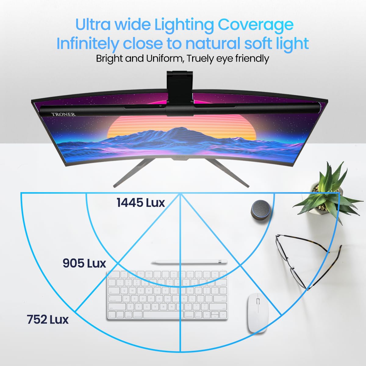 【Professional Eye-Caring Desk Lamp & Premium Support】The long version of 20inch computer monitor light bar is powered via USB and works perfectly on top of curved monitors or ultrawide monitors, giving you more valuable space on your desk. Illuminance ≥1200lux, computer monitor light perfect as a home office desk lamp. Troner Monitor Light has passed the IEC62778 anti-blue light certification standard. Welcome guide, and friendly customer support.