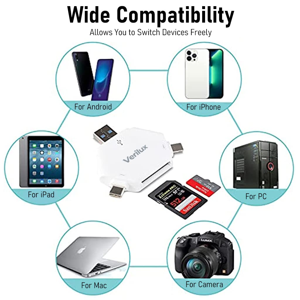 SD/TF CARD READER 3 IN 1: Verilux triangle 3 in 1 card reader combines the Lightning, Type-C, USB A, three frenquently used interfaces into one card reader, allows you can access the SD card /Micro SD card not just with pc or laptop, but also with more mobile phone devices of iOS or Android system. No need to switch different card reader any more. Each interface is also with a magnet cap which can give a well protection to plug, prolonging the service life.